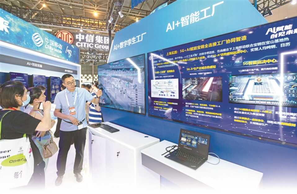新时代以来,我国加快实施创新驱动发展战略,完善科技创新体制机制,创新活力竞相迸发。图为7月4日,观众在2024世界人工智能大会上了解AI赋能智慧工厂。新华社发