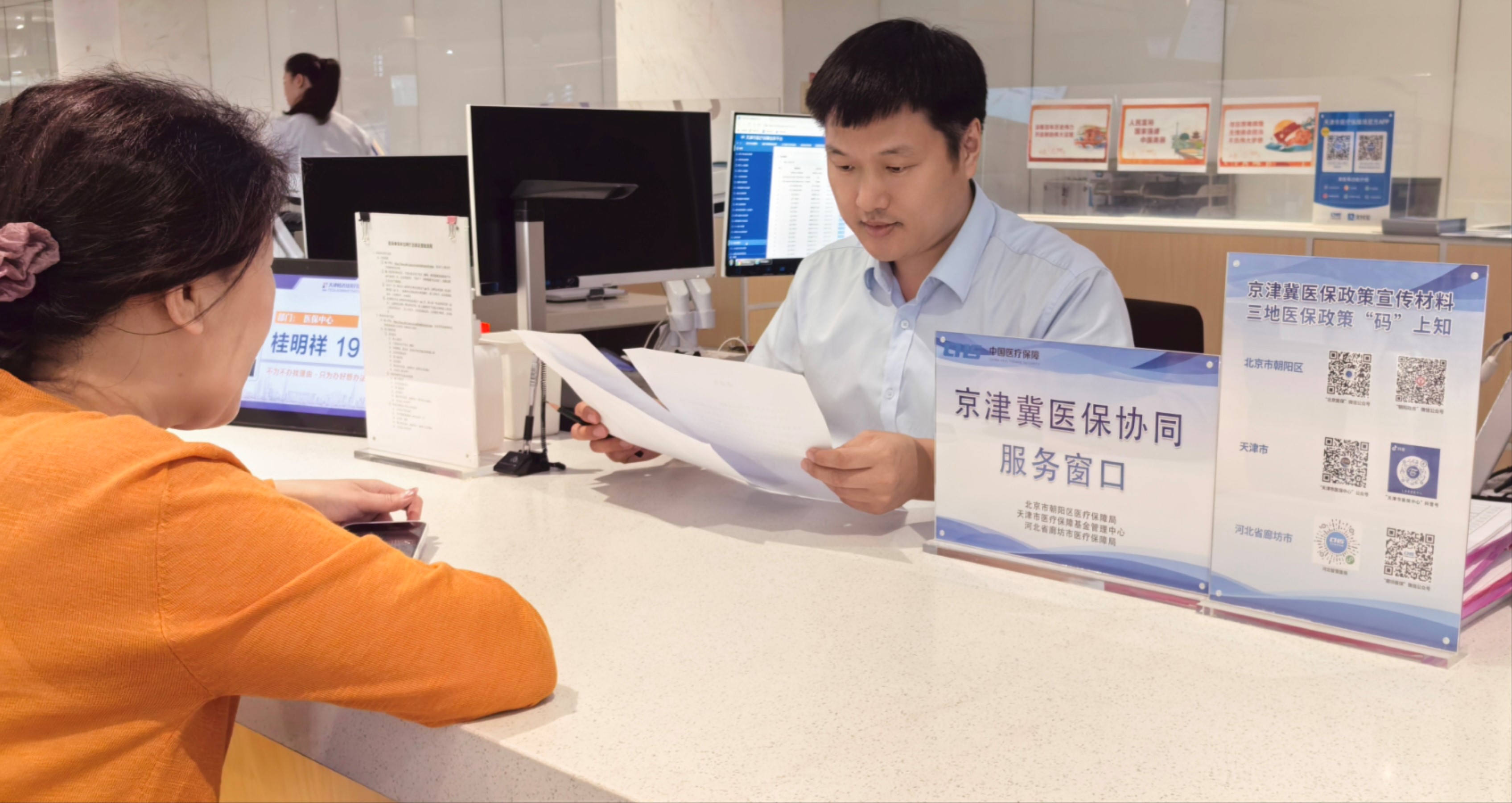 图为医保分中心工作人员在京津冀医保协同服务窗口为参保人员办理医保业务