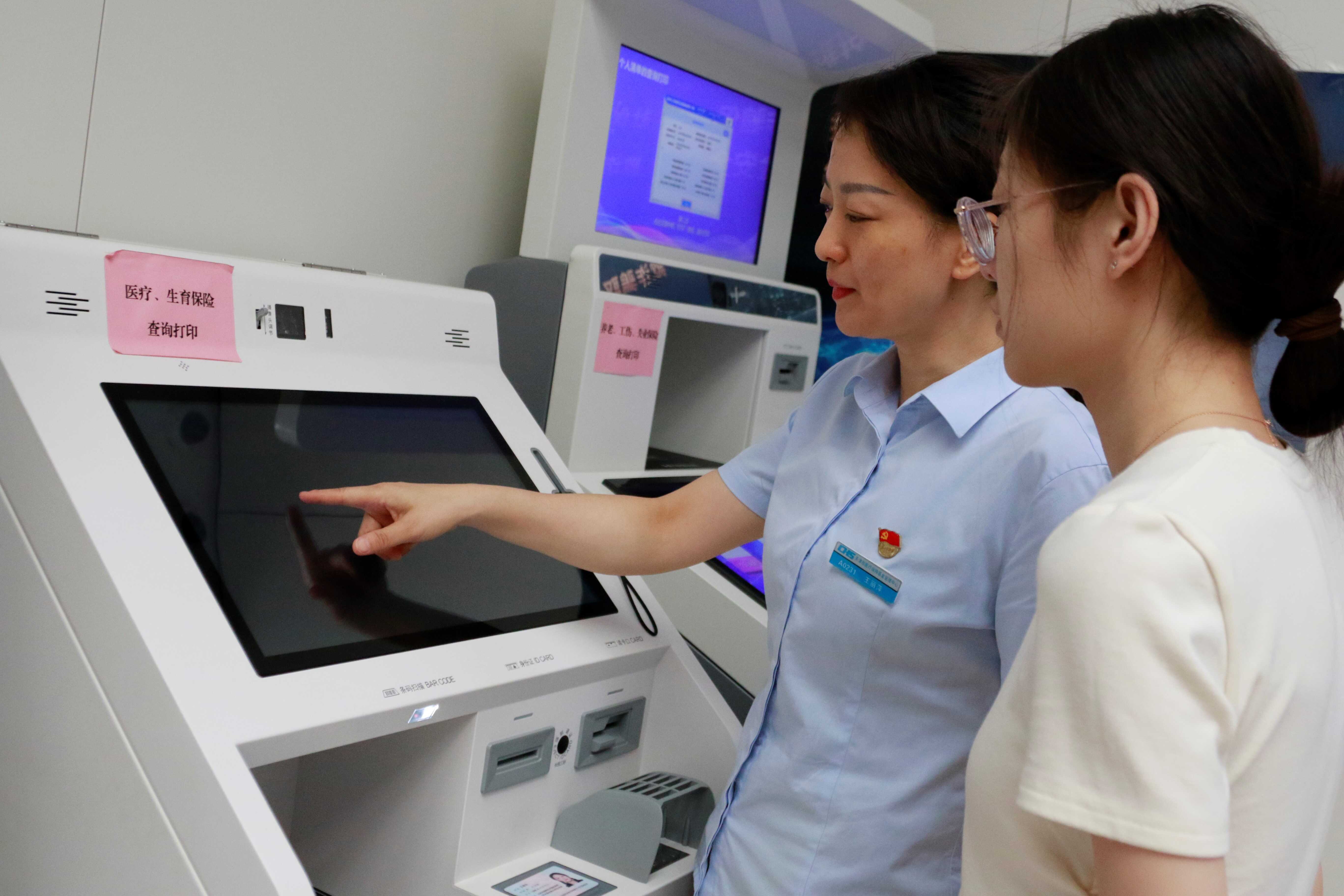 图为医保分中心工作人员为参保人员演示自助机操作流程
